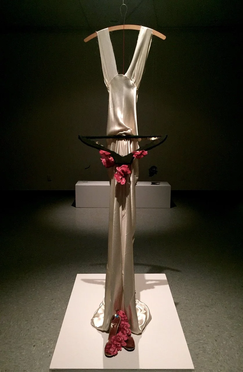 Standing wordless in a cream-colored silk charmeuse gown, her hem billows around her feet. A gold coin and a few blue ceramic beads rest on the tip of gold lamé heels and a bouquet of red and pink cloth flowers vine across both shoes toward the tips of her toes. A black, upside-down vintage hanger suspends from her waist, dotted with the same flowers.